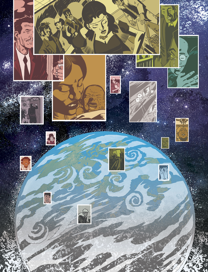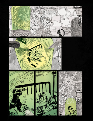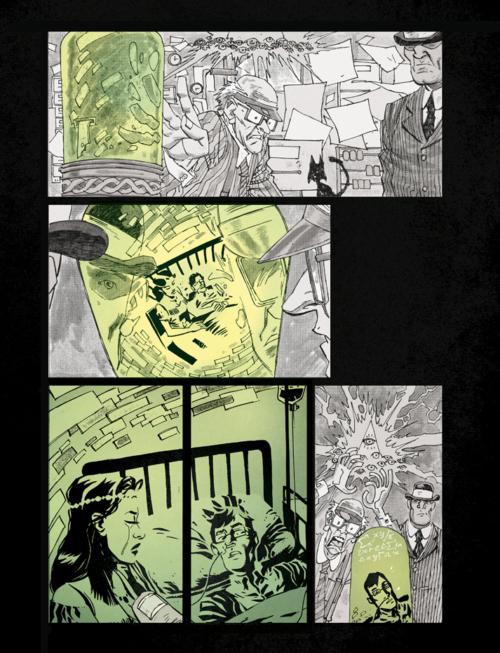 “When Si first proposed Numbercruncher to me, it was clear we’d need to play with some different techniques for this multi-layered, multi-reality story,” says P.J. Holden, co-creator. “Flipping between the afterlife and the real world was a key element, and we needed something to make those realities distinct. And, being a huge fan of the Pressburger and Powell film A Matter of Life and Death (a romance about a dying World War II pilot, which similarly flits between a monochromatic afterlife and a technicolour real world), it seemed fairly obvious that the best way to do that was to have the afterlife be a sort of dreamy, textured black and white world, and the real world a much more comic book style, pure lineart with colour.