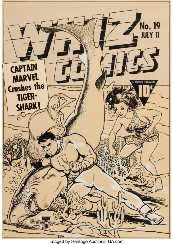 In this playful yet precisely composed image, as the text on the cover explains, “Captain Marvel Crushes the Tiger-Shark!” Indeed, judging by the bewildered expression on the gasping shark’s face, Captain Marvel is getting the better of his foe with a powerful headlock.