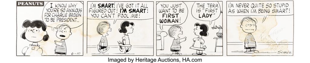 Other highlights include but are not limited to the assortment of Golden Age heroes collected in the Marvels No. 1 double splash pages painted by Alex Ross for the blockbuster 1994 four-issue origin retelling; a sweet if cheesy page from Batman No. 13 (1942) by Bob Kane, Jerry Robinson and George Roussos, in which Batman reassures Robin how much he cares for the Boy Wonder; and an original 1960 Charles Schulz Peanuts topical daily strip, featuring Lucy and Linus discussing a Charlie Brown presidential candidacy.