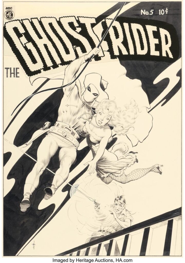 Fantasy artist extraordinaire Frank Frazetta is represented with an outstanding specimen of original cover art for The Ghost Rider No. 5 from 1951. Featuring one of the classic Frazetta femmes that would become one of his hallmarks, this kinetic cover presents Ghost Rider as almost a Wild West Batman, a masked vigilante swinging to the rescue against a backdrop of gun smoke.