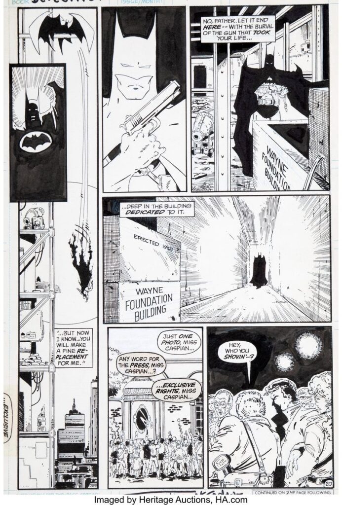McFarlane’s interior Dark Knight work is also represented in the auction. Page 20 of Detective Comics No. 578 from the previous year captures a poignant moment in which Batman disposes of Joe Chill’s gun – the very weapon that ended the lives of his parents and set a young Bruce Wayne on the path to becoming the Caped Crusader.