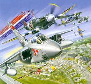 Away from DC Thomson and over (almost) to Look and Learn. Regular Look and Learn aircraft artist Wilf Hardy has produced many painted covers for UK air show brochures, as can be seen on Jeremy Briggs’ piece on him over on Bear Alley. A selection of these paintings for the annual air show at RAF Waddington have now been produced as special limited edition packs with proceeds going to the RAF Benevolent Fund and the RAF Association. The set of 14 A5 prints feature 10 paintings by Wilf Hardy, 2 by his replacement on the Waddington brochures Tim O’Brien, and two joint efforts. Price is £5 plus £1.50 UK P&P and they are available by sending a cheque payable to “Timothy O’Brien” to 15 Angelica Court, Bingham, Nottingham, NG13 8SU. There are more details about the packs on Tim’s website. If you like Hardy’s aircraft illustrations in Look and Learn then these are well worth purchasing.