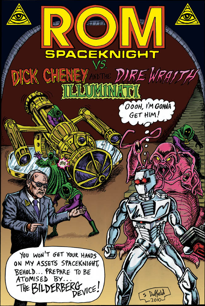 • As part of ongoing promotion for his War Comix project, Sean Duffield sent us this fun Rom Spaceknight cartoon. We suspect there’s a tip of the hats to the latest Wikileaks revelations, too…