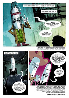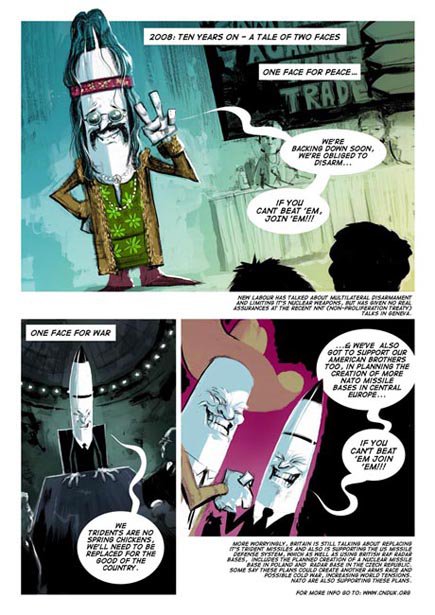 | A page from “A Tale of Two Faces” by Sean Duffield & Nelson Evergreen – a current story about nuclear weapons and the double-talk of politicians |